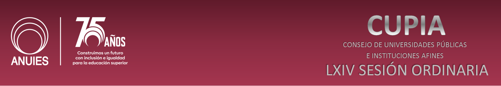 Con fundamento en los artículos Trigésimo, Trigésimo Primero y Trigésimo Tercero, fracción VI, del Estatuto de la Asociación Nacional de Universidades e Instituciones de Educación Superior de la República Mexicana, A.C. (ANUIES), convocamos a las y los titulares de las instituciones que integran el Consejo de Universidades Públicas e Instituciones Afines (CUPIA), a la LXIV Sesión Ordinaria que se efectuará en modalidad presencial, en la Universidad Autónoma de Tamaulipas, Centro Universitario Tampico Madero S/N, Universidad Poniente, C.P. 89336, Tampico, Tamaulipas, a las 10:00 horas del viernes 17 de octubre de 2025, con el siguiente::